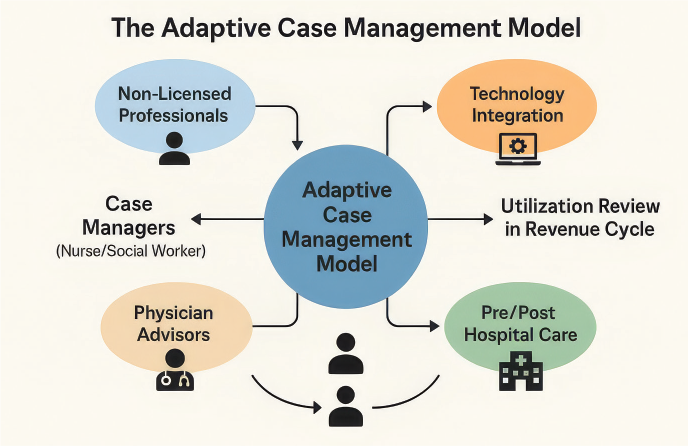 The traditional triad model of hospital case management is no longer sufficient in today’s fast-paced healthcare environment. The Adaptive Model provides flexibility to the local landscape and the transformative nature of healthcare. The model encompasses disciplines outside nurses and social workers as integral to the case management team such as non-licensed professionals, physician advisors and pre or post hospital case management roles. The Adaptive Model requires a new workforce with strong communication skills and technology acumen who can leverage the fast-paced technological advancements currently on the horizon in the case management space. Finally, the model expands the focus outside inpatients to encompass independent staffing structures for emergencies, pre-surgical, bedded outpatients and post-discharge outpatient settings. The Adaptive Model leans into the change for utilization review from one part of the three-legged stool to its own specialized set of professionals deeply tied to the clinical revenue cycle team members, thus shifting some of the requirements back to the case management team members. As healthcare continues to evolve, the Adaptive Model offers a pathway to a more efficient, patient-centered case management approach.
